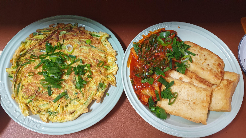 두부가 엄청 크고, 요리 만으로도 배가 부를거 같았다. 일단 밥은 두명이 1공 하려고 계획을 세웠으나, 식사가 끝날때까지 밥뚜껑을 여는 일은 없었다. 간도 적당해 밥 없이도 모든 요리들이 조화로웠다. 두부는 부쳐먹으니 겉바속촉으로 더욱 먹을맛이 났고 호박전은 간장을 찍지않고 두부김치를 올려 말아 먹으니 금방 없어졌다.